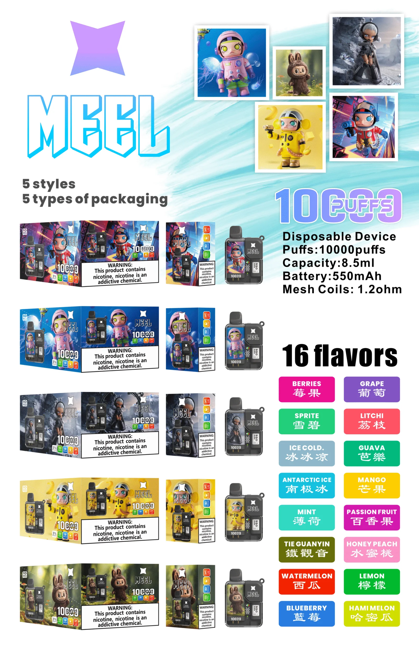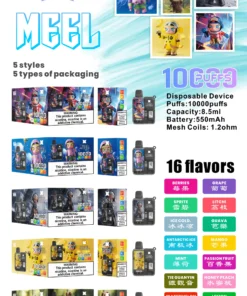 MEEL 10000 Puffs 電子煙 是一款集 設計感、性能與收藏價值 於一身的限量電子煙。此系列由 泡泡瑪特(POP MART) 與電子煙品牌 MEEL 聯名打造,機身印有超人氣角色 Molly、Skullpanda、Hamcus,深受粉絲喜愛。憑藉 10000 口 的驚人吸數與 550mAh 電池、8.5ml 煙油,帶來穩定順暢的長效體驗,讓使用者在品味濃郁煙霧的同時,也能感受獨特的藝術魅力。